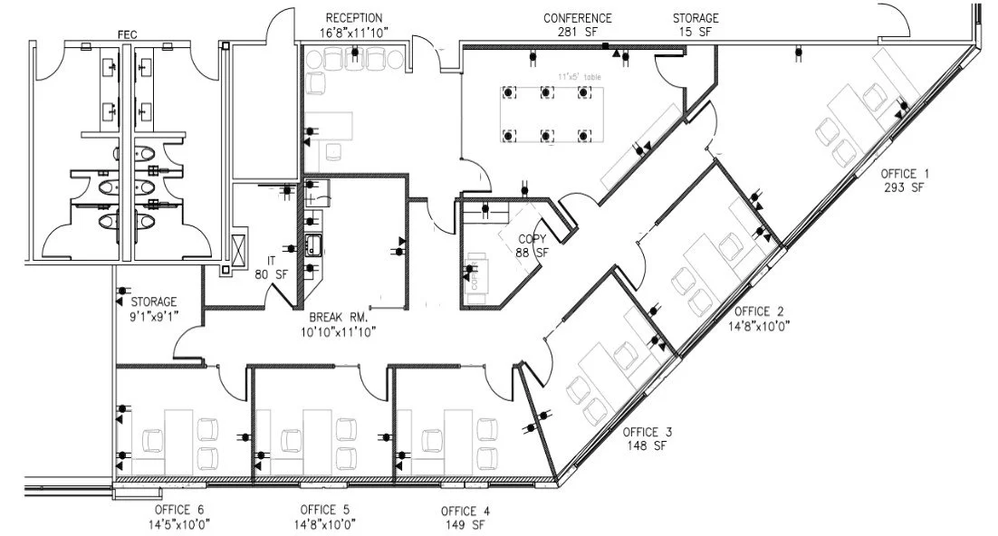 Available office space with 2,774 NRA including two conference rooms, executive office, three offices, break area, copy area, reception, and a large open work area.